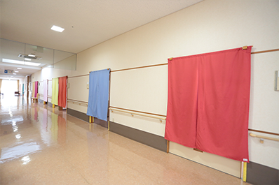 家庭的な雰囲気を目指すために各居室には扉ではなくノレンにしてあります。 そして、同じ色のノレンではなく入所者にとって自分の部屋が認識しやすく出入りも容易く物音がしても直ぐにわかるよう各々が異なるノレンにしてあります。