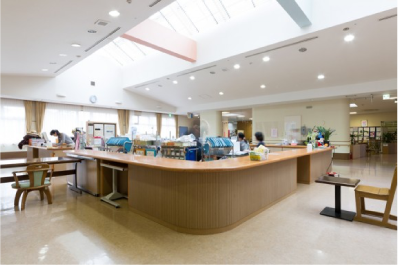 サービスステーションが建物の中心にあり壁などの隔たりがなく四方が見渡せるようになっており、入所者の様子がわかりやすくスタッフ側、家族の方に安心感をもたらします。全職員は制服ではなく、私服になっております。これは、入所者・通所者との関係が家庭的でへだたりがなく、お互いが話しやすい環境を作り出すためであります。