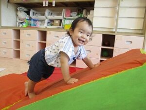 - 三角マットのすべりだい、上手に登れたよ♪