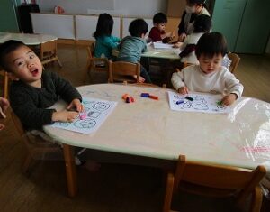 - どの色のクーピーにしようかな?ぬりぬり、かきかき♪