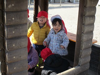 - ログハウスで砂遊び、「いらっしゃいませ~」