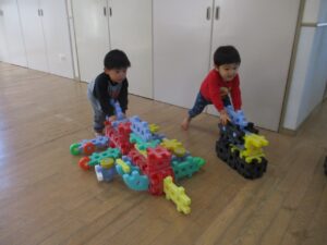 - ジョイントマットを繋げて遊びました。「僕だけのおうち!いいでしょ~」