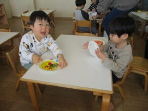 - 色付きの寒天で製作遊び!「握ると潰れて小さくなっていく!」不思議な感触だね。