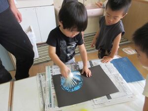 - 紙コップを切り開いて絵の具を付け、スタンプぺったん!花火の製作を楽しみました。