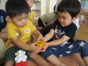 - こぐま組で育てたパプリカを一緒に観察。「一緒に持ってみよう!」「ツルツルしてる~!」