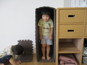 - ジョイントマットを繋げて遊びました。「僕だけのおうち!いいでしょ~」