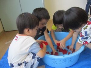 - 色付きの寒天で製作遊び!「握ると潰れて小さくなっていく!」不思議な感触だね。