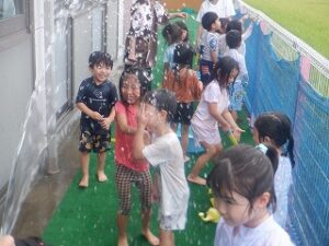 - テラスで水遊び!「雨みたい!気持ち良い~」