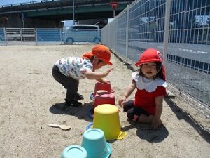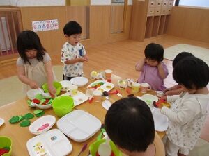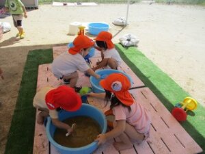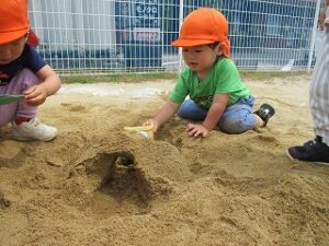 - 砂の感触、気持ちいいね。ごちそうもいっぱい作ろうよ。