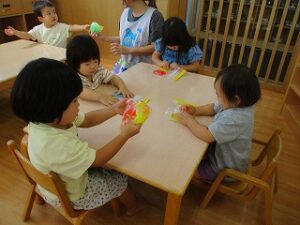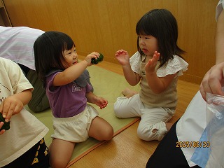 - 「見て~、ピーマン」「いいな、私にも触らせて」