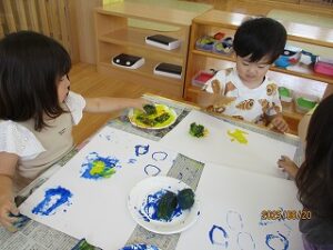 - ピーマンでスタンプ遊び!!「わぁー、おもしろい」