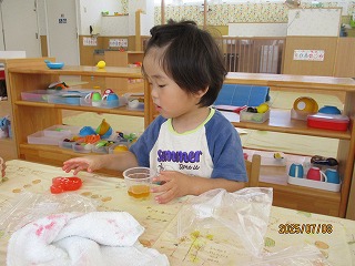 - 寒天ってプニプニしてるね!見て、形が変わったよ~