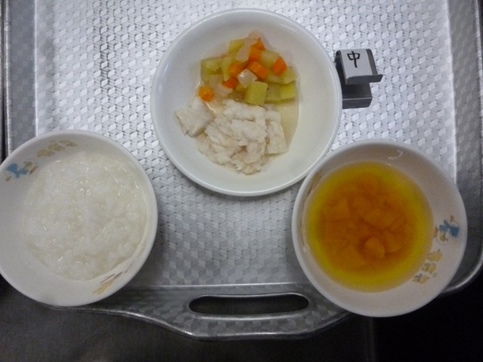 1507namamugi_5月7・・21日 中期食 おかゆ かぼちゃのみそ汁 カレイの甘辛煮 さつまいもの煮物