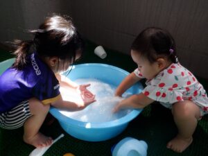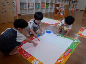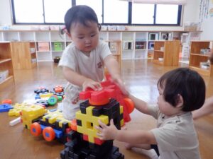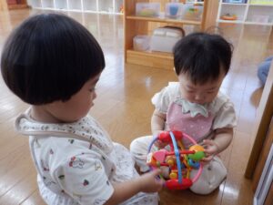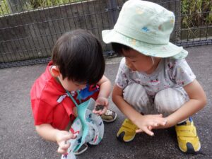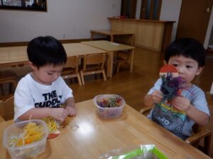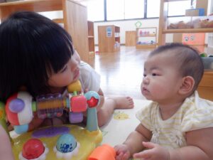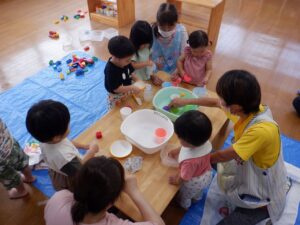 2025年度の写真 9月 泡でブクブク楽しいね♪ 涙がでていた子に、さりげなくおもちゃを渡すやさしい お姉さん。泣き止んで遊んでいるね☆ 「これなんだ?」「なにかいるかな?」真剣に観察中です! みのむしの体に毛糸をぺたぺた。かわいいみのむしができたね✨ 8月 赤ちゃんかわいいね✨このおもちゃ楽しいよ(o^―^o) わっ!何か下から色がでてきたよ♪みんなで塗ってみよう! 寒天ってぷにゅぷにゅして気持ちいいね♪みんなでごちそうを作ろぉー☆ 二人で一緒に車を作ったよ♪「ここはこうして・・・ここにはめて・・・」って聞こえてきそうです。 7月 「つめたぁ~い」と言いながら、ずっと氷を触っていると、手が冷たくなってきたぁ~💦 土の中から大きいお芋や小さいお芋!色々な形なお芋もたくさんでてきたね✨ 色のついたはるさめ!つるつるしておもしろいね♪ 初めての水あそび💦気持ちいいかな? 6月 四季の広場にトノサマガエルがいました。アマガエルはよく見るけど、トノサマガエルはじめて。その大きさにみんなびっくり! 今年初めての水あそび♪ 冷たくて気持ちよかったね☆ 暑くて公園や園庭にいけないので、室内で 滑り台ができてうれしいね♪ 「泡ぶくたった煮え立った♪」と歌いながらみんなで手を繋ぎ、昔の遊びを知りました。 5月 今日は砂場遊び。どれを持っていこうかな?これに決~めた!! 井ゲタブロックでゴジラを作りました。かっこいいでしょ♪ こいのぼりお楽しみ会で兜を作ったよ♪素敵な兜ができたかな? ザリガニやカタツムリに興味津々! みんなに見られて、ザリガニやカタツムリが恥ずかしくなって隠れちゃったね。 4月 「みてみてだんご虫がいるよ」「丸まってるね」 おいしそうなごちそうがいっぱい!何を作ろうか な? アイスクリームうまくできるかな? 井ブロックで作った電車!二人で出発進行♪ Post Views: 52 « 2022年度の写真
