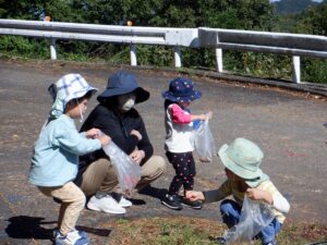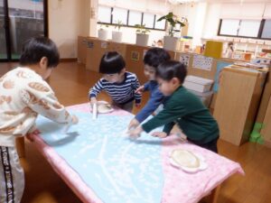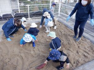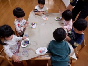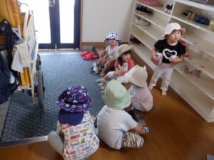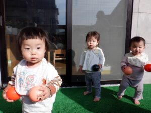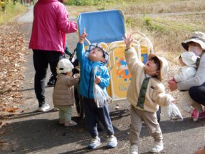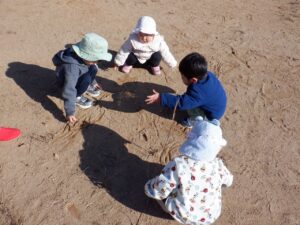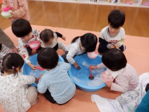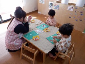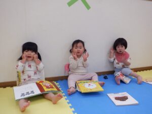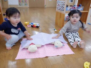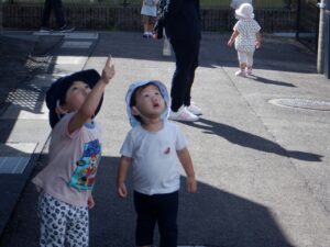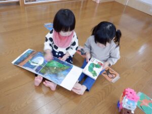 2025年度の写真 1月 暖かい日、0歳児だけでテラスにでました。人工芝にも慣れ、大好きなボールを持ち、いちにいちに♪ 寝る前に窓を見てみると雪が降ってきました。思わず窓の側に行き空を見上げて雪に見とれていました。 「大山にたくさん雪を降らせよう!」と言って、大山の形をした画用紙に白のスタンプで真っ白にしました。 「はらぺこあおむし」の絵本は大きいバージョンと小さいバージョンがあり、一緒に見比べ見て楽しんでいます。 12月 雪遊び。冷たいけどおもしろい♪アイスクリームやかき氷屋さんのようにカップにいっぱい氷を入れて楽しいな♪ 運動場は広いキャンパス!いっぱい描けるし、何度でも描けちゃうね☆ ぬいぐるみに布団をかけて「ねんねんよ」小さな先生です♡ クリスマスツリーがどんなふうにできるのか楽しみだね♪ 11月 0歳児3名様です!りすぐみさんも一緒にお散歩うれしいね♪ 上を見ると、まつぼっくりがたくさん木についていました。落ちてこないかなぁ~、採りたいよぉ~・・・ どの色で描こうかな?色々な色があるね☆ 「ここかな?」「こっちかな?」砂場での芋ほりごっこ。どこに隠れているのかな?みんなが真剣に探しています。 10月 「あそこにお月様がみえるよ」と二人で観察!昼の空にお月様が見えたね🌙 自分でお散歩の準備中。がんばって靴を履いています。今日はどこに行くのかな? どんぐりがいっぱい落ちてるね♪ 袋いっぱいになるまで拾うぞぉ~✨ 保育者が絵本を読む前の手あそびから真似をして、友だちや保育者に絵本を読んでくれます♡ 9月 泡でブクブク楽しいね♪ 涙がでていた子に、さりげなくおもちゃを渡すやさしい お姉さん。泣き止んで遊んでいるね☆ 「これなんだ?」「なにかいるかな?」真剣に観察中です! みのむしの体に毛糸をぺたぺた。かわいいみのむしができたね✨ 8月 赤ちゃんかわいいね✨このおもちゃ楽しいよ(o^―^o) わっ!何か下から色がでてきたよ♪みんなで塗ってみよう! 寒天ってぷにゅぷにゅして気持ちいいね♪みんなでごちそうを作ろぉー☆ 二人で一緒に車を作ったよ♪「ここはこうして・・・ここにはめて・・・」って聞こえてきそうです。 7月 「つめたぁ~い」と言いながら、ずっと氷を触っていると、手が冷たくなってきたぁ~💦 土の中から大きいお芋や小さいお芋!色々な形なお芋もたくさんでてきたね✨ 色のついたはるさめ!つるつるしておもしろいね♪ 初めての水あそび💦気持ちいいかな? 6月 四季の広場にトノサマガエルがいました。アマガエルはよく見るけど、トノサマガエルはじめて。その大きさにみんなびっくり! 今年初めての水あそび♪ 冷たくて気持ちよかったね☆ 暑くて公園や園庭にいけないので、室内で 滑り台ができてうれしいね♪ 「泡ぶくたった煮え立った♪」と歌いながらみんなで手を繋ぎ、昔の遊びを知りました。 5月 今日は砂場遊び。どれを持っていこうかな?これに決~めた!! 井ゲタブロックでゴジラを作りました。かっこいいでしょ♪ こいのぼりお楽しみ会で兜を作ったよ♪素敵な兜ができたかな? ザリガニやカタツムリに興味津々! みんなに見られて、ザリガニやカタツムリが恥ずかしくなって隠れちゃったね。 4月 「みてみてだんご虫がいるよ」「丸まってるね」 おいしそうなごちそうがいっぱい!何を作ろうか な? アイスクリームうまくできるかな? 井ブロックで作った電車!二人で出発進行♪ Post Views: 100 « 2022年度の写真
